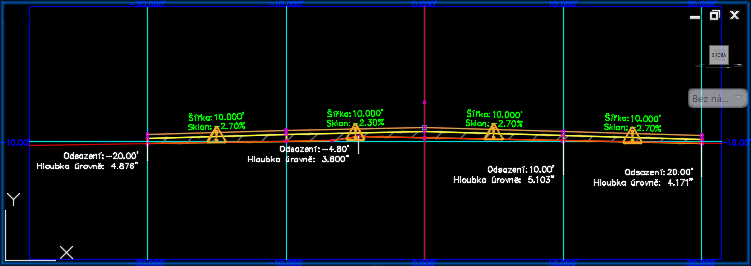 Jedná se o výšku profilu návrhu pro vybrané staničení. Výška profilu návrhu pro úsek koridoru oprav je definována vertikální základnou, která byla ke koridoru oprav přiřazena při jeho vytvoření ve vlastnostech koridoru.