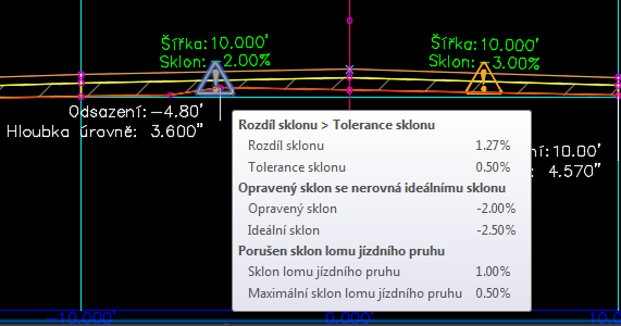 Pokud se opravený příčný sklon nerovná ideálnímu příčnému sklonu, zobrazí se porušení.