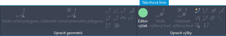 Pokud je návrhová linie dynamicky spojena s koridorem, většina příkazů k úpravě návrhové linie na pásu karet nebude k dispozici. V následující ilustraci jsou zobrazeny panely pro úpravu na kontextové kartě pásu karet Návrhová linie, pokud je vybrána dynamická návrhová linie. K zobrazení dat můžete použít příkazy Editor výšek a Rychlá úprava výšek. Tyto příkazy však neslouží k úpravě dat.