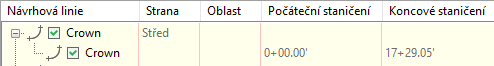 Pokud je návrhová linie spojena s nadřazeným koridorem, bude ve sloupci Typ spojení v zobrazení položky Návrhové linie ve stromové struktuře Prospektor zobrazena možnost Koridor. Pokud není návrhová linie připojena, bude sloupec Typ spojení prázdný. Návrhové linie jsou odlišeny pomocí různých ikon.