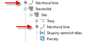 Návrhové linie mohou být vytvořeny v rámci staveniště nebo mimo staveniště. Návrhové linie vytvořené mimo staveniště se zobrazí v kolekci Návrhové linie ve stromové struktuře Prospektor. Návrhové linie vytvořené v rámci staveniště se zobrazí v kolekci Návrhové linie v rámci kolekce Staveniště.