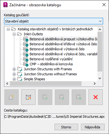 Z dialogu můžete pracovat s katalogem potrubí nebo stavebních objektů a procházet kategorie v rámci tohoto katalogu.