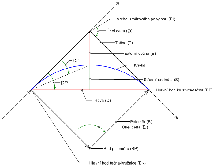 Na následujícím obrázku jsou uvedeny parametry oblouku, které používá aplikace Autodesk Civil 3D