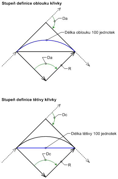 - Definice tětivy: Určuje, že je způsob definice oblouku založen na tětivě. Tuto možnost použijte, když je obloukem oblouk železnice. V případě oblouku železnice má způsob definice oblouku hodnotu úhlu ve středu kruhového oblouku přepjatého tětivou o velikosti 100 jednotek.