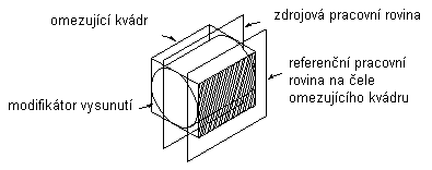 Pracovní rovina reference se definuje jako rovina na plošce rozšíření modifikátoru. Každý modifikátor obsahuje neviditelné pole rozšíření nebo hranice, které definuje rozšíření prvku. Můžete vytvořit pracovní rovinu, která odkazuje na jednu z rovin rozšíření. Chcete-li definovat pracovní rovinu reference, vyberte modifikátor a zdrojovou pracovní rovinu, která představuje směr roviny, jenž chcete vytvořit. Pole rozšíření nebo hranice prvku je zjištěno a jsou na výběr dvě platné pracovní roviny reference. V případě přesunutí nebo změny velikosti modifikátoru se přesune také referenční pracovní rovina.