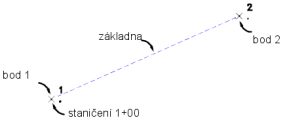 Základna prochází od bodu 1 do bodu 2. Bod 1 je nastaven jako staničení 1+00. Směr a vzdálenosti se uvádějí v aktuálních jednotkách, pokud nezadáte kvalifikační příponu.