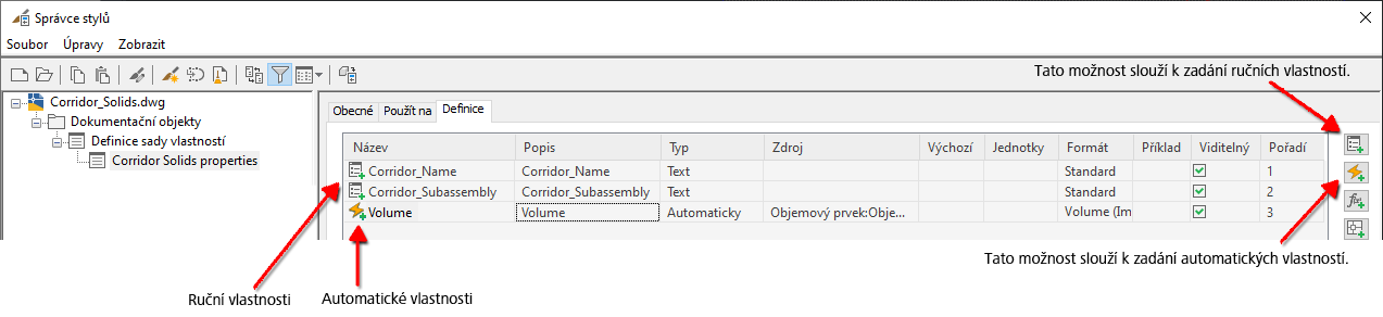 Vytvořte novou sadu vlastností a nastavte ruční a automatické vlastnosti, které chcete přiřadit k objektům.