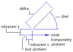 - Počáteční bod, délka a úhel: Pomocí tohoto způsobu ukotvíte počáteční bod komponenty čáry ke komponentě kotvy. Pak zadáte délku a úhel. V následujícím obrázku je znázorněna čára definovaná tímto způsobem: