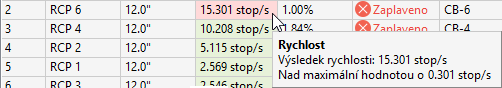 Pokud je rychlost nižší než minimální rychlost nebo vyšší než maximální rychlost uvedená v nastavení, bude tento sloupec vybarven červeně. Při umístění ukazatele myši na buňku se zobrazí místní nápověda zobrazující hodnotu, o kterou je rychlost pod minimální nebo nad maximální rychlostí.