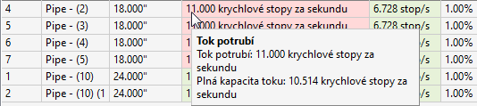 Tento řádek se zobrazí v případě, že byla na stránce Obecné vybrána možnost Změnit velikost potrubí a znovu nastavit dna potrubí nebo Vypočítat energetické linie spádu a čáry hydraulického sklonu.