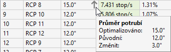 Pokud je jako typ analýzy na stránce Obecné vybrána možnost Změnit velikost potrubí a znovu nastavit dna potrubí a změní se velikost průměru potrubí, zobrazí se v tomto sloupci šipka nahoru nebo šipka dolů. Při umístění ukazatele myši na šipku se zobrazí místní nápověda s vysvětlením, jak byla velikost potrubí změněna.