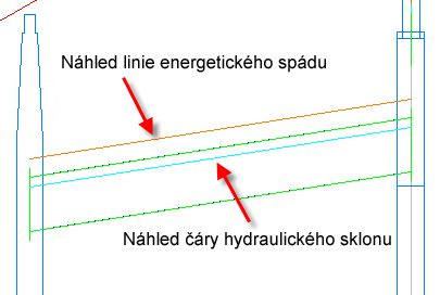 Na následujícím obrázku je v náhledu znázorněn detail linií energetického spádu a čar hydraulického sklonu.