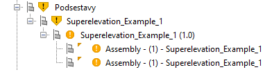 Pokud je třeba aktualizovat cestu k souboru PKT podsestavy, zobrazí se u položek ve stromu prospektoru značky a popisky, které vás na to upozorní.