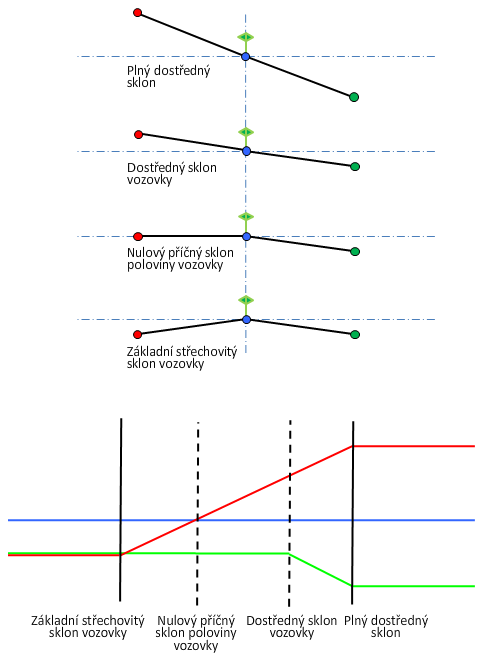 Vysvětlení diagramů klopení vozovky najdete v části Metody klopení osy otáčení okolo bodů otáčení.