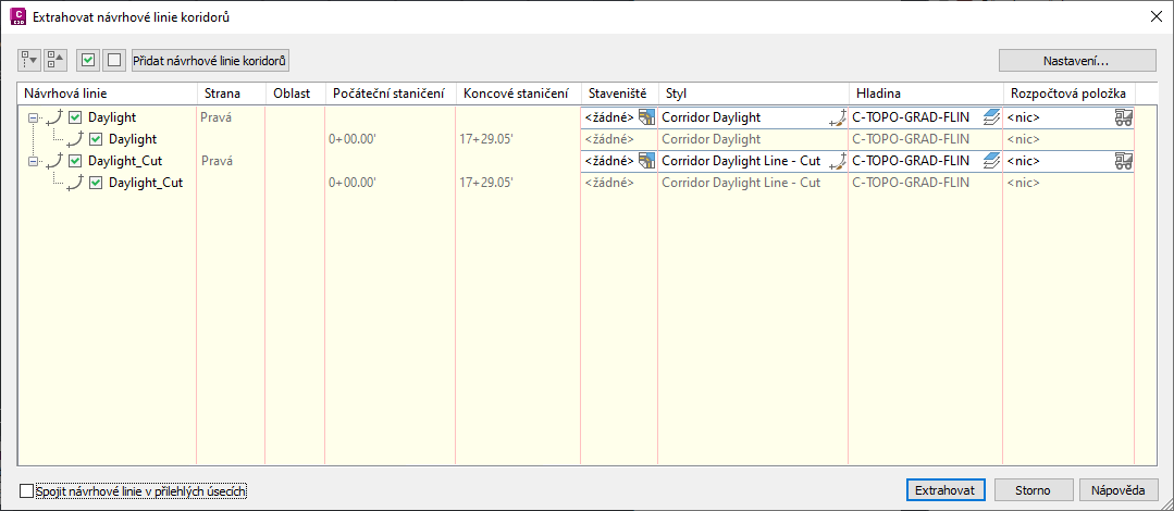 Výběr návrhových linií: Zaškrtnutím nebo zrušením zaškrtnutí políček změňte výběr návrhových linií, které budou extrahovány. Kliknutím na možnost Přidat návrhové linie koridorů se vrátíte k výzvě na příkazovém řádku, ve které můžete vybrat další návrhové linie.