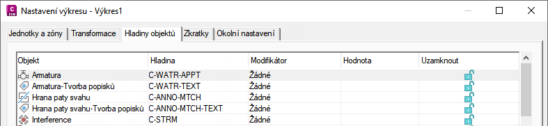 Hladina objektů se definuje v Nastavení výkresu anebo při vytváření. Hladiny komponent jsou definovány ve stylech objektů.