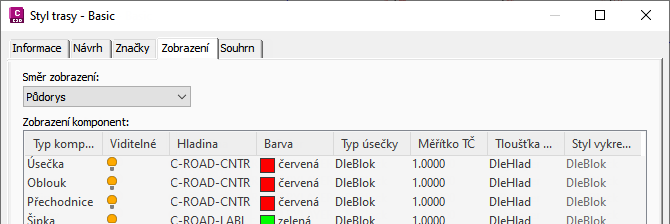 Můžete určit hladiny komponent na kartě Zobrazení <objekt> dialogu Styl. V následujícím příkladu jsou zobrazeny hladiny používané pro komponenty tras:
