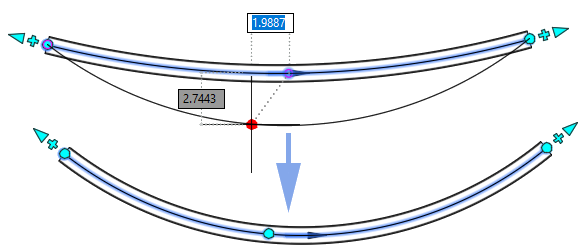 Následující obrázek znázorňuje vybraný uzel poloměru a vizuální orientační body geometrie zakřiveného potrubí při úpravě poloměru.