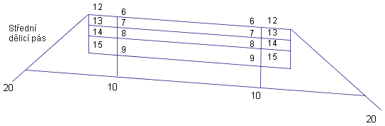 Na následujícím obrázku je znázorněno umístění standardních kódů spojnic na podsestavách definujících směrově rozdělenou komunikaci se sníženým středním dělicím pásem a prodlouženými krajnicemi.