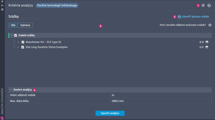 Počáteční uživatelské rozhraní kritérií analýzy umožňuje zadat data srážek pro testování aktuálního systému odvodnění. Pokud nebyly pro projekt nakonfigurovány sady srážek, budete z rozhraní moci otevřít pouze Správce srážek. K zahájení procesu analýzy jsou vyžadována data srážek.
