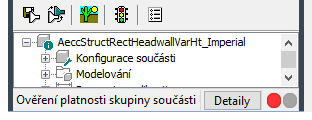 Pokud model obsahuje chyby, zobrazí se na stavovém řádku hlášení, že ověření platnosti součásti selhalo, a zobrazí se dialog s výpisem chyb. Zkontrolujte chyby, proveďte nezbytné úpravy a opakujte tento krok, dokud nebude ověření platnosti úspěšné.