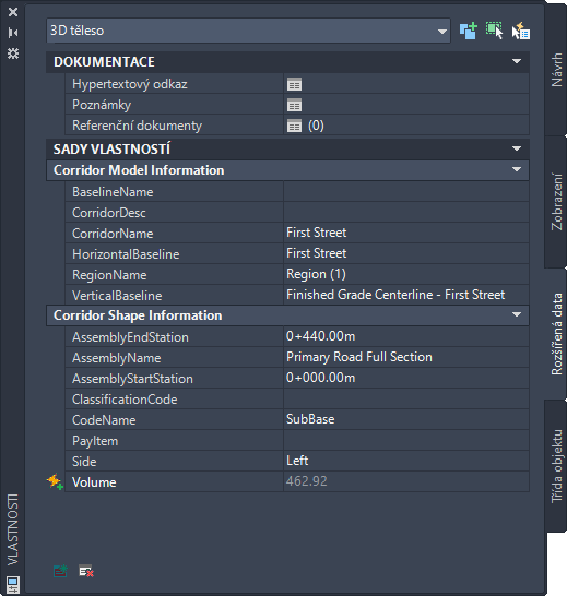Ve výchozím nastavení jsou v aplikaci Autodesk Civil 3D zahrnuty tři definice sad vlastností, které platí pro koridory i pro 3D objemová tělesa a 3D tělesa: