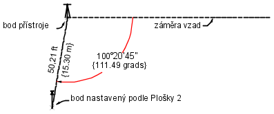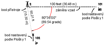 Bod 101 je umístěn ve směru vodorovného úhlu 0° vpravo od Plochy1, s využitím svislého úhlu 100 a ve vzdálenosti 30,480 od bodu přístroje s popisem BS.