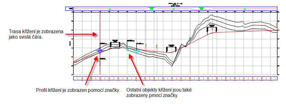 Do zobrazení profilů můžete přidat křížení, která identifikují, kde se lineární objekty kříží s profilem vzhledem k nadřazené trase.