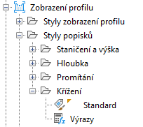 Objekty křížení používají styly popisků křížení zobrazení profilu.