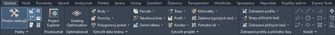 Pás karet aplikace Autodesk Civil 3D je primární uživatelské rozhraní poskytující přístup k příkazům a funkcím.