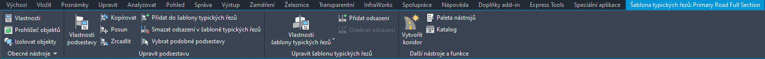 Pokud například vyberete objekt trasy, zobrazí se kontextová karta Trasa. Panel Další nástroje a funkce na kontextové kartě Trasa obsahuje množství příkazů, které můžete dále využívat. Z trasy můžete například vytvořit koridor, křižovatku nebo datovou zkratku.