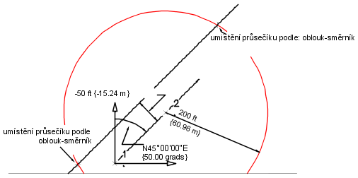 Průsečíky se nacházejí mezi obloukem o poloměru 200 se středem v bodu 2 a směrníkem 50,0000 nakresleným od bodu 1 se vzdáleností odsazení 50 stop vlevo.