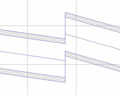 Je-li tato možnost nezaškrtnutá, vzhled potrubí u spojení potrubí v zobrazení profilů nebude začištěn takto. Následující ilustrace zobrazuje profil potrubí při spojení potrubí a s vypnutou možností začištění potrubí.