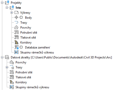 Obrázek znázorňuje knihovny projektu aplikace Vault pro projekt s názvem Trio a projekt datových zkratek s názvem Oblouk. Oba typy projektů se vytvářejí z výchozí šablony projektu. V důsledku toho mají totožné kolekce povrchů, tras a dalších objektů, na něž lze odkazovat ve více výkresech.