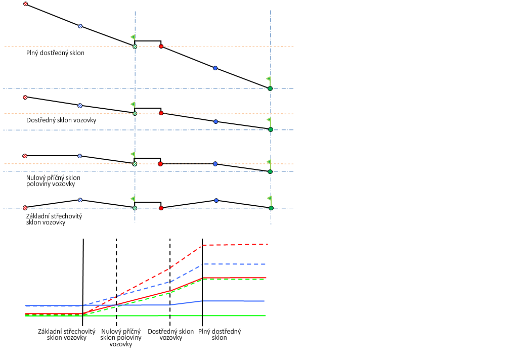 Vysvětlení diagramů klopení vozovky najdete v části Metody klopení osy otáčení okolo bodů otáčení.