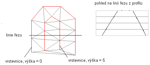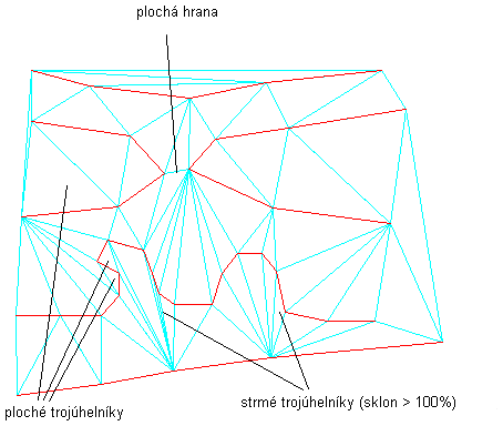 V následujícím obrázku je povrch s plochými oblastmi, kde se z červených čar vrstevnic vytvářejí trojúhelníky (světle modré) povrchu. Některé ploché trojúhelníky a rovné hrany se vyznačují vlastnostmi:
