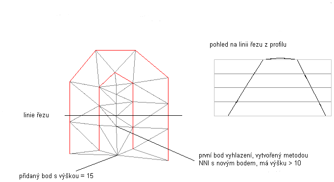 V tomto případě je možné data vrstevnice doplnit přidáním bodu s výškou bodu poblíž otevřeného konce vrstevnice tak, jak ukazuje následující obrázek. Potom operace Minimalizovat ploché oblasti vytvoří vrchol střechovitého sklonu tak, jak je vyžadováno.