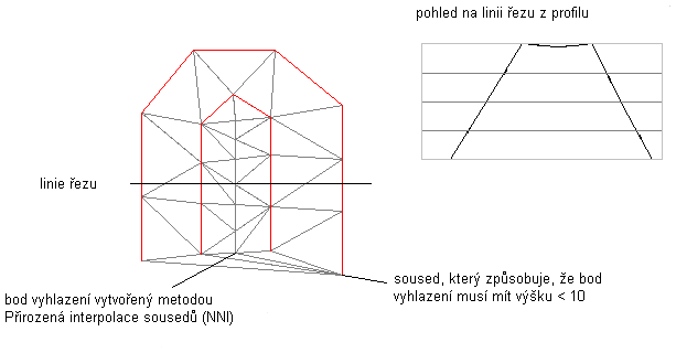 Tyto výsledky vzniknou, protože interpolace NNI používá okolní body k určení odpovídající výšky pro nový bod. Protože všechny okolní výšky jsou nižší než je plochý trojúhelník, pro přidané body se vyberou výšky menší než je plochý trojúhelník a výsledkem je klesání hřebene.