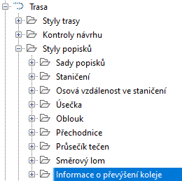 Styly popisků informací o převýšení koleje jsou k dispozici v knihovně stylů popisků trasy: