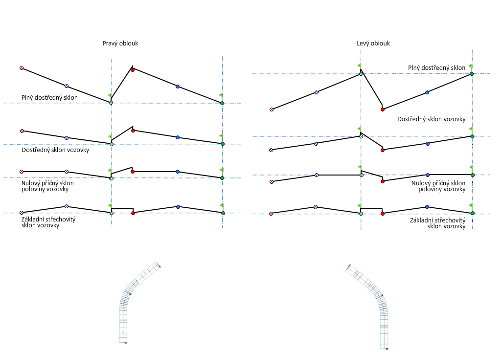 Následující obrázek uvádí metodu natočení na pravé straně pro směrově rozdělenou vozovku se střechovitým příčným sklonem.
