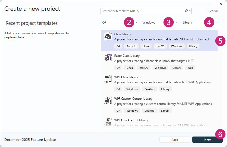 - In the Templates list, select Class Library - A project for creating a class library that targets .NET or .NET Standard.