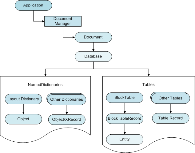 The Database object contains all of the graphical and most of the non-graphical AutoCAD objects. Some of the objects contained in the database are entities, symbol tables, and named dictionaries. Entities in the database represent graphical objects within a drawing. Lines, circles, arcs, text, hatch, and polylines are examples of entities. A user can see an entity on the screen and can manipulate it.
