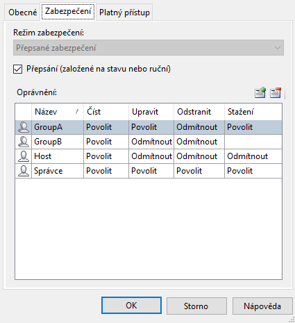 Platné zabezpečení V dolní části dialogu se zobrazuje platné zabezpečení, které se aktuálně používá u objektu. Ve výše uvedeném příkladu se používá přepsání zabezpečení (založené na stavu nebo ruční).