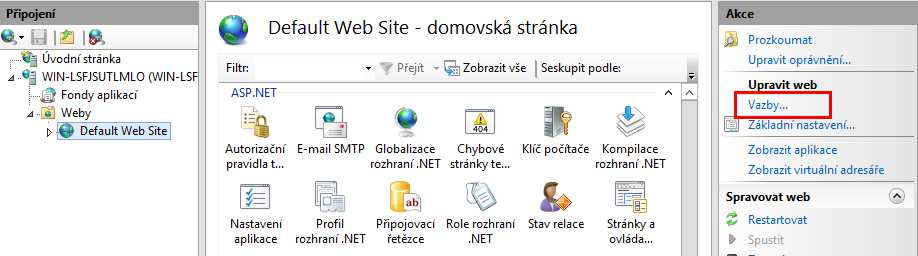 Rozbalte strom Weby a vyberte web, který hostuje virtuální adresář AutodeskDM. Na obrázku je to web Default Web Site (výchozí web). Vyberte web Default Web Site (výchozí web) a v podokně Akce klikněte na položku Vazby.