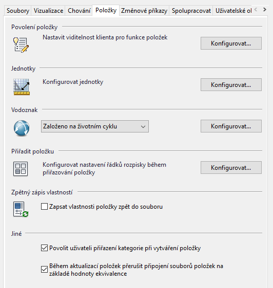 Karta Položky v dialogu Nastavení úložiště obsahuje možnosti konfigurace měrných jednotek, správy vodoznaků, konfigurace nastavení řádků rozpisek a povolení zápisu vlastností položek zpět do asociovaných souborů. Můžete rovněž zakázat funkci Položky.