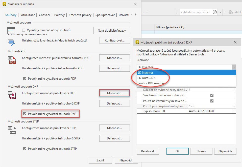 | Odeslat do umístění zdrojového souboru | Automaticky uloží publikovaný soubor DXF do vybraného umístění souboru. |