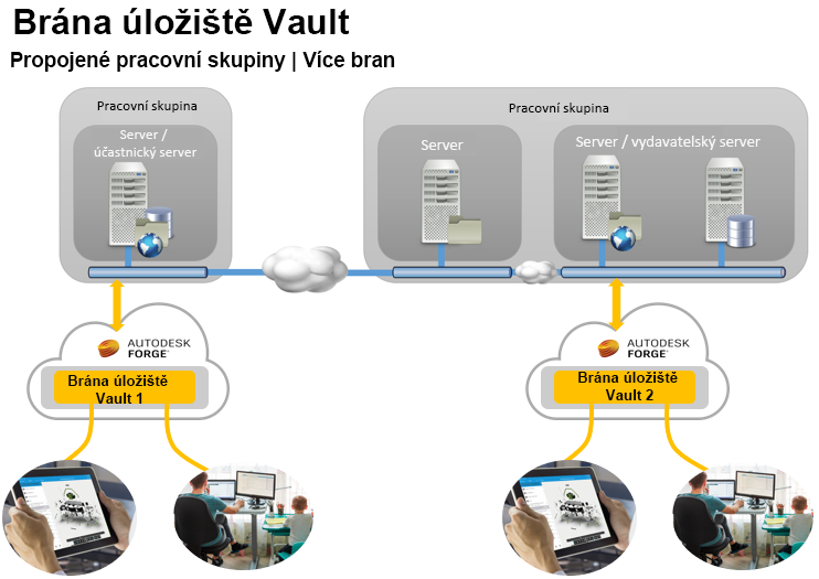 Technologie bran úložiště Vault bezpečně připojuje vzdálená zařízení k serverům úložiště Vault prostřednictvím cloudové služby. Služba brány úložiště Vault vygeneruje adresu URL, která se při přihlašování ke klientskému softwaru (například Vault Client nebo různé doplňky) použije místo názvu serveru úložiště Vault. Cloudová služba komunikuje se serverem úložiště Vault a v reálném čase vyměňuje data mezi klientem a serverem.