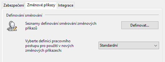 Úpravy seznamů směrování a definic pracovních postupů na kartě Změnové příkazy v dialogu Globální nastavení
