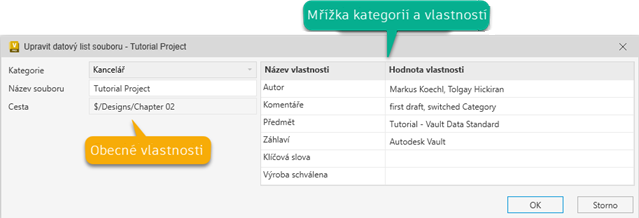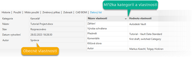 Mřížka obecných vlastností obsahuje statické definice, popisek a ovládací prvek obsahu vázaný na vlastnost úložiště Vault. Ty jsou uloženy v definičním souboru dialogu. Dynamická mřížka je prázdný objekt mřížky, který automaticky přidává popisky a pole hodnot prostřednictvím výběru kategorie entity (soubor, složka, uživatelský objekt). Tyto dvě mřížky jsou základními prvky v částech Vytvořit/upravit datové listy (viz obrázek výše) a Datové listy na kartách podrobností: