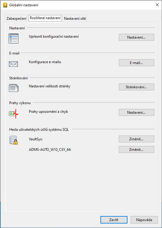 Hesla uživatelských účtů systému SQL | Umožňuje změnit heslo pro účty služby SQLVaultSys a ADMS_%NázevServeru%. |